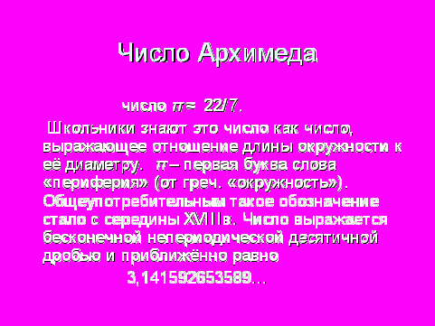 - (Слайд № 9). Число Архимеда – число π ≈ 22/7.