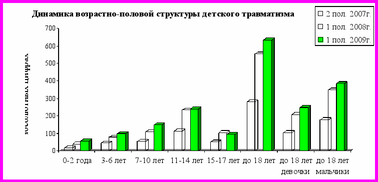 Пик травм приходится на возраст 11-14 лет, чаще у мальчиков. В сравнении с первым полугодием 2008 года отмечаем рост травматизма по всем возрастным группам (кроме подростков 15-17 лет), как среди мальчиков, так и среди девочек.