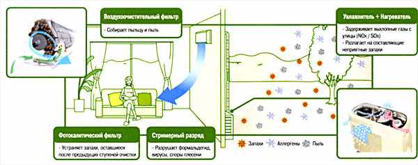 В кондиционере применена схема двухстадийной очистки воздуха - в наружном и внутреннем блоках. На первой стадии специальный катализатор разлагает неприятные запахи, а также удаляет выхлопные газы (NОх, SOх), которые могут присутствовать в атмосферном воздухе. Воздухоочистительный фильтр останавливает содержащиеся в воздухе пыль и пыльцу. Вторая стадия очистки содержит фотокаталитический фильтр и источник стримерного разряда.