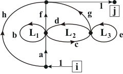 Существует более экономный метод, основанный на принципах высшей алгебры и на простейших топологических преобразованиях в форме преобразования графов [2, 5]. Сущность этого метода основана на определении общего выражения передачи T для любого графа. Этот граф, при заданных i и j, представляет в топологической форме вид и характер требуемой технологической связи kIJ, т.е.