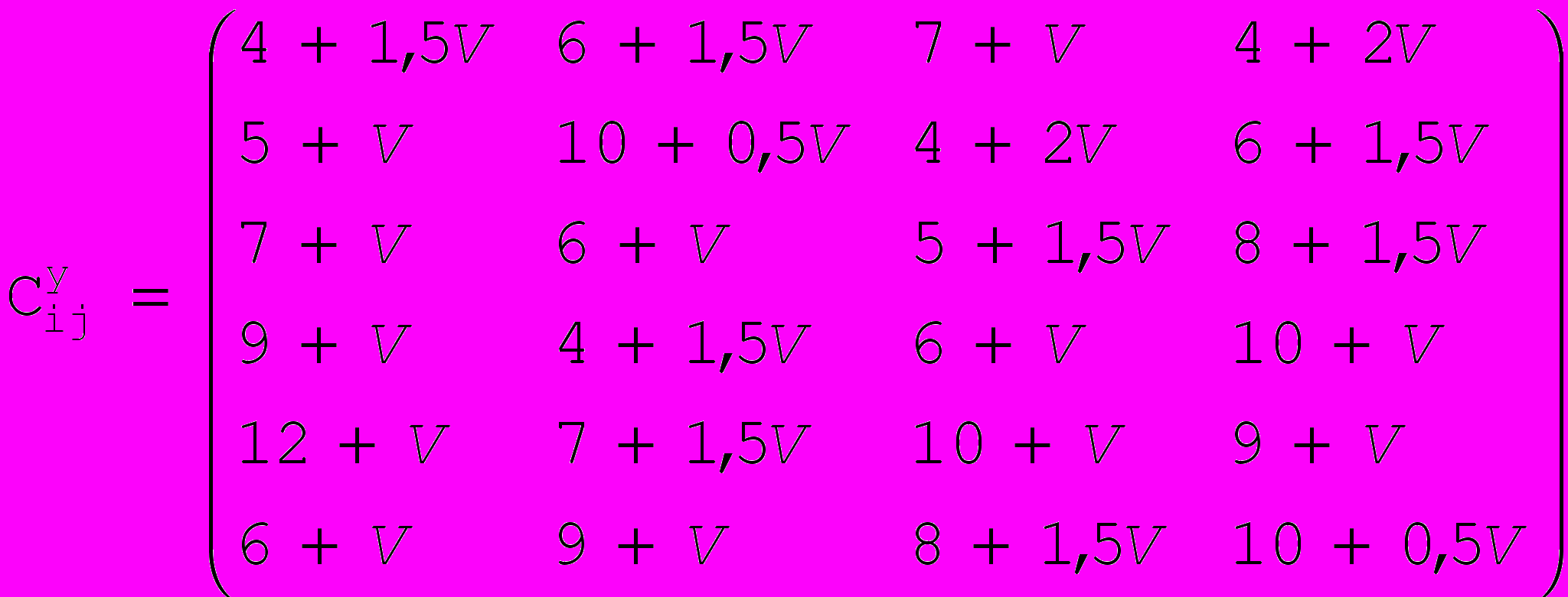 При данных мощностях предприятие не справляется с удовлетворением спроса на продукцию, поэтому перед руководством предприятия встает вопрос о расширении производства, что выражается либо в постройке новых филиалов, либо расширении имеющихся. Для этого руководство предприятия решает взять кредит. Известны потенциальные мощности существующих и новых филиалов (таблица 3). Для расширения производства предполагается приобретение за счет кредита нового дополнительного оборудования и дополнительных сырьевых ресурсов. Известно количество продукции, производимое одной единицей оборудования в год (bj) (таблица 6). Стоимость единицы оборудования для производства продукции каждого вида (j) (таблица 6). Также известна стоимость единицы сырья ( = 2200+15V). Известны удельные затраты на производство продукции Cijу.