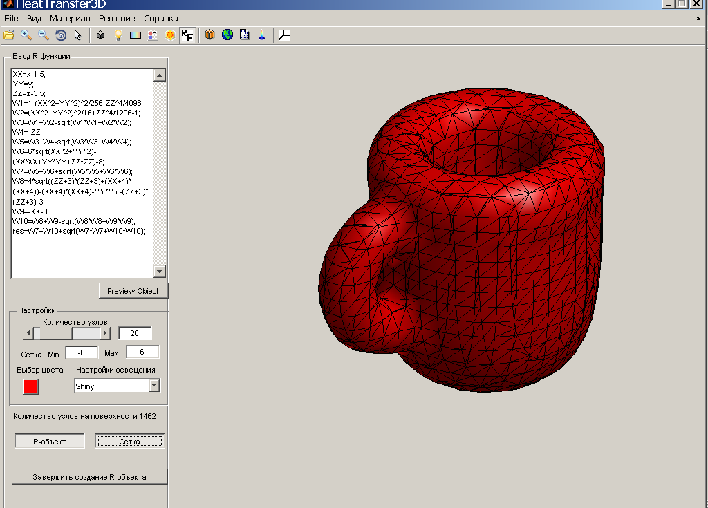 Для численного решения краевой задачи теплопроводности в сложных 3D-областях по приведенной итерационной схеме создается система компьютерного моделирования (СКМ-АФ) на основе метода двойного замещения и метода фундаментальных решений с использованием математических средств теории атомарных функций [3-4]. На рис.1 представлена твердотельная модель, созданная с помощью пакета твердотельного моделирования SolidWorks и загруженная в СКМ-АФ.