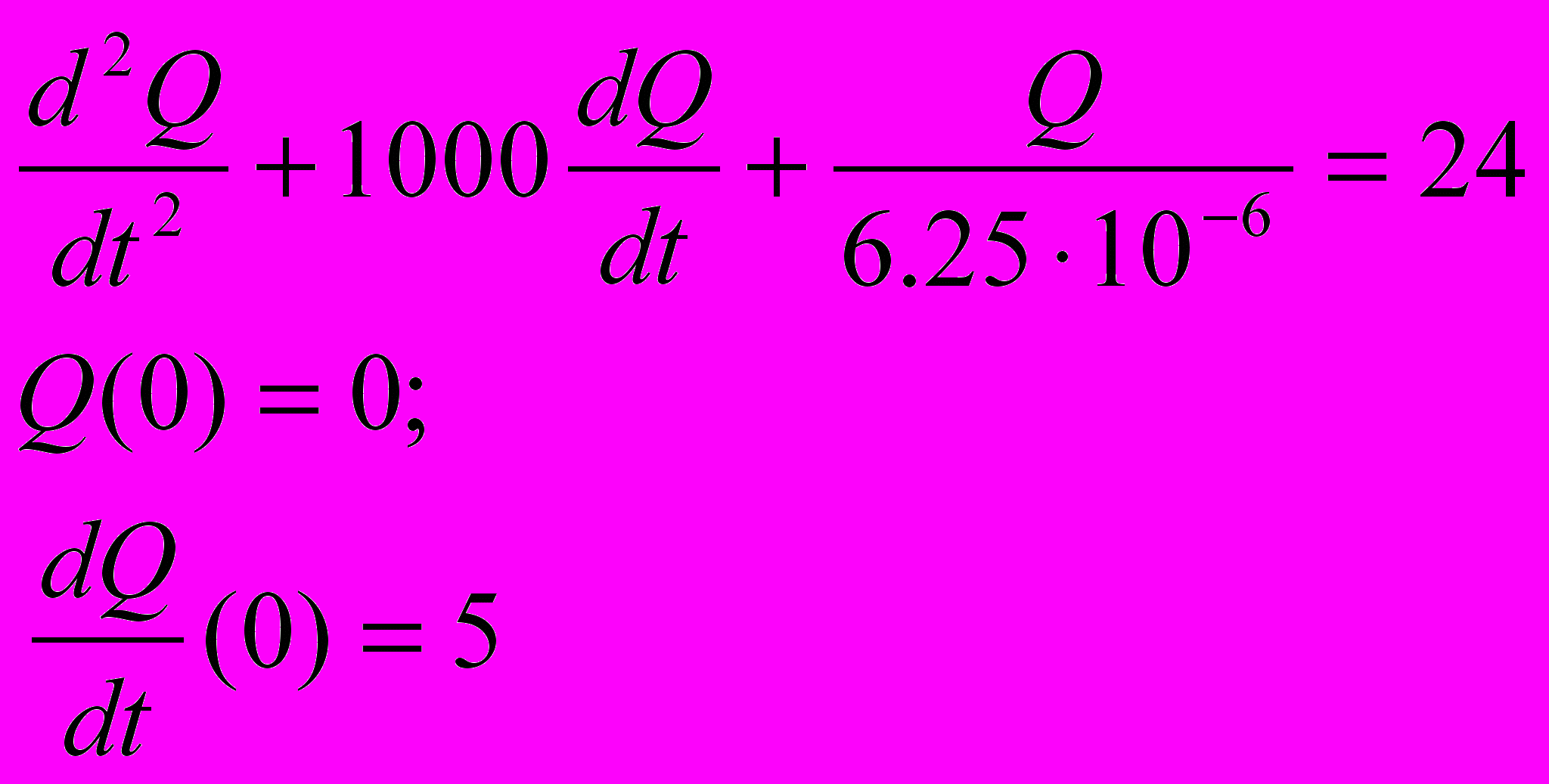 Ф. Начальный заряд в контуре равен нулю и в момент времени t=0 к нему прикладывается постоянная э.д.с. равная 24 В. Требуется определить величину тока в момент t=0.1, для чего нужно решить следующее дифференциальное уравнение: