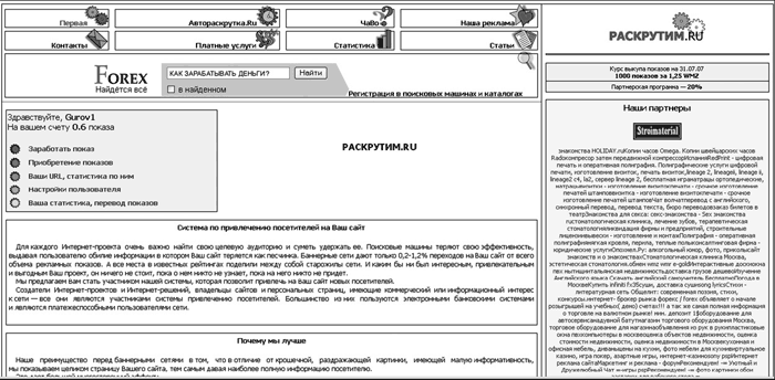На РАСКРУТИМ.RU пользователям показывается страница рекламируемого сайта целиком. Для того чтобы заработать «показ», ее надо просматривать 30 секунд. Это в совокупности с некоторыми техническими особенностями положительно выделяет РАСКРУТИМ. RU из ряда подобных систем.