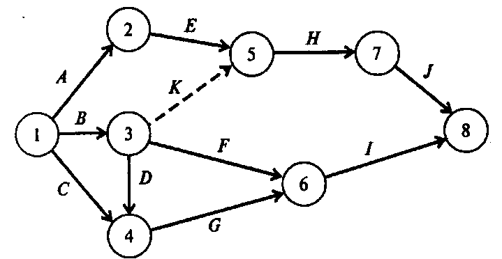 На этом рисунке работа, выходящая из вершины 3 и входящая в вершину 5, является фиктивной. Ее продолжительность равна нулю.