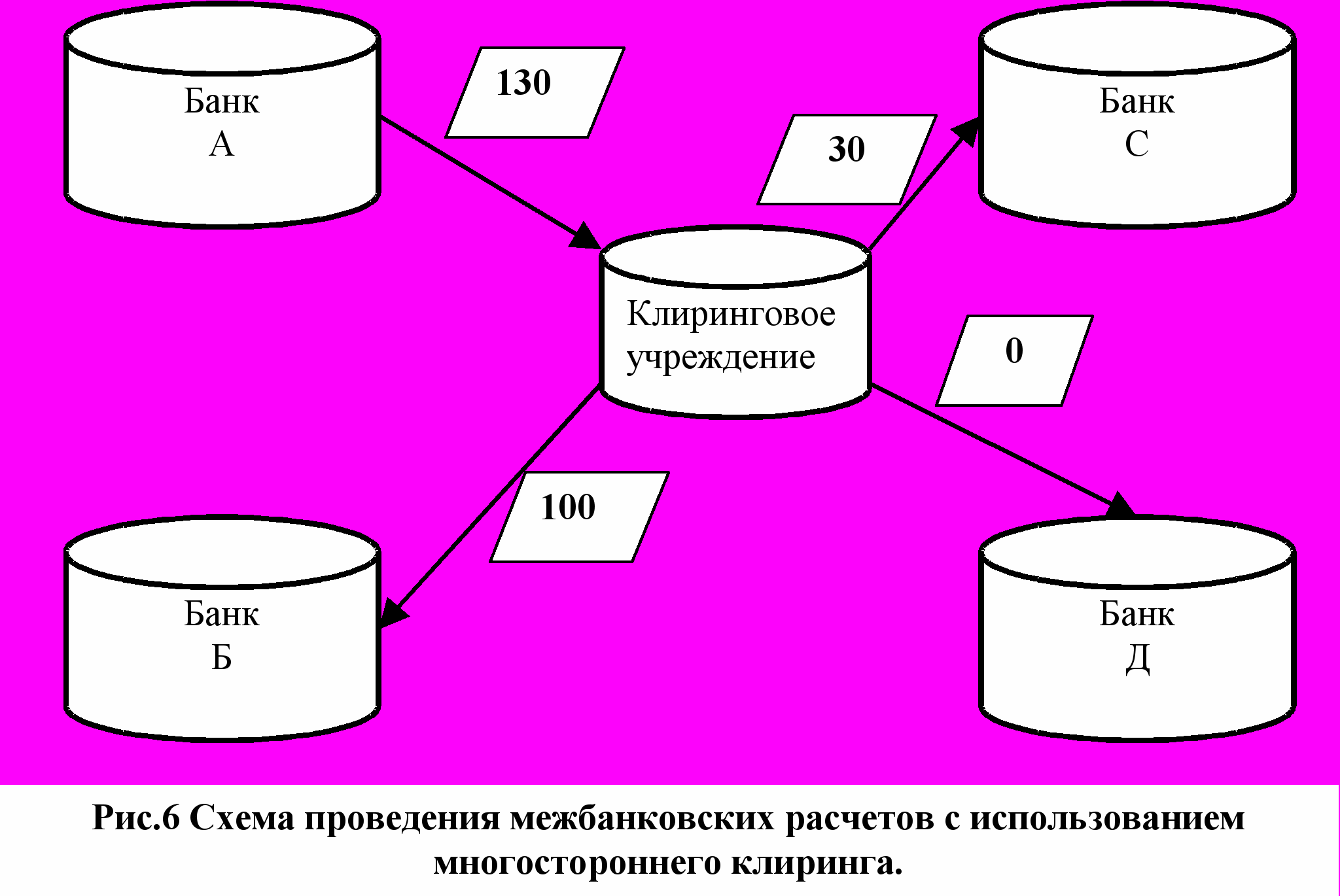 Проведение многостороннего клиринга предполагает наличие клирингового учреждения, на балансе которого учитывается межбанковский, многосторонний зачет требований и обязательств. Иллюстрация потоков платежей при многостороннем зачете и расчете на чистой основе приводится на рис. 6. На этом рисунке по данным примера расчетов на валовой основе вычисляются чистые расчетные позиции банков, а затем происходит многосторонний клиринговый расчет.