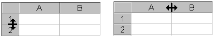 Чтобы показать строку, можно установить указатель мыши сразу под утолщенной границей заголовка строки (указатель мыши примет вид на рис.25 (1)) и перетянуть ее вниз. Чтобы показать столбец, следует установить указатель мыши вплотную справа от утолщенной границы заголовка столбца (указатель мыши будет иметь вид на рис.25 (2)) и перетянуть ее вправо.