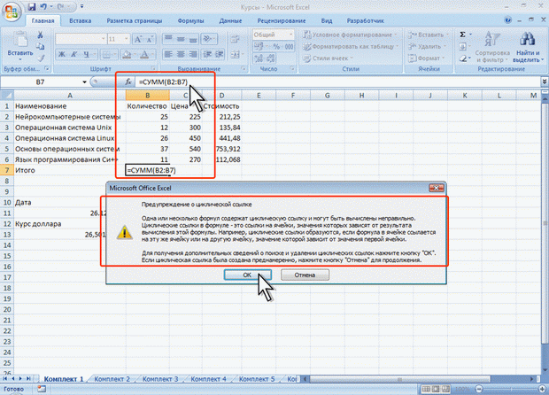 Excel обнаруживает ошибки, связанные с циклическими ссылками. Циклической ссылкой называется последовательность ссылок, при которой формула ссылается (через другие ссылки или напрямую) сама на себя. Например, в диапазон аргументов формулы СУММ в ячейке В7 в таблице на рис. 6.24 включена ячейка В8. При обнаружении циклической ссылки выходит окно сообщения. Нажатие кнопки ОК не приведет к исправлению ошибки. Лучше нажать кнопку Отмена и внести исправления самостоятельно.