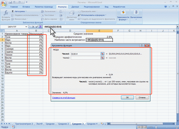 Математические вычисленияО математических функцияхМатематические функции используют при выполнении арифметических и тригонометрических вычислений, округлении чисел и в некоторых других случаях. СуммированиеПростая суммаДля простейшего суммирования используют функцию СУММ. Синтаксис функции СУММ(А), где A – список от 1 до 30 элементов, которые требуется суммировать. Элемент может быть ячейкой, диапазоном ячеек, числом или формулой. Ссылки на пустые ячейки, текстовые или логические значения игнорируются. Фактически данная функция заменяет непосредственное суммирование с использованием оператора сложения (+). Формула =СУММ(В2:В7), указанная в ячейке В8 (рис. 7.1), тождественна формуле =В2+В3+В4+В5+В6+В7. Однако есть и некоторые отличия. При использовании функции СУММ добавление ячеек в диапазон суммирования автоматически изменяет запись диапазона в формуле. Например, если в таблицу вставить строку, то в формуле будет указан новый диапазон суммирования. Аналогично формула будет изменяться и при уменьшении диапазона суммирования. ![]() Рис. 7.1. Простое суммирование Выборочная суммаИногда необходимо суммировать не весь диапазон, а только ячейки, отвечающие некоторым условиям (критериям). В этом случае используют функцию СУММЕСЛИ. Синтаксис функции СУММЕСЛИ(А;В;С), где A – диапазон вычисляемых ячеек. В – критерий в форме числа, выражения или текста, определяющего суммируемые ячейки; С – фактические ячейки для суммирования. В тех случаях, когда диапазон вычисляемых ячеек и диапазон фактических ячеек для суммирования совпадают, аргумент С можно не указывать. Можно суммировать значения, отвечающие заданному условию. Например, в таблице на рис. 7.2 суммированы только студенты по странам, при условии, что число студентов от страны превышает 200. ![]() Рис. 7.2. Выборочное суммирование Можно суммировать значения, относящиеся к определенным значениям в смежных ячейках. Например, в таблице на рис. 7.3 суммированы только студенты, изучающие курсы со средней оценкой выше 4. Критерий можно ввести с клавиатуры или выбрать нужную ячейку на листе. ![]() Рис. 7.3. Выборочное суммирование УмножениеДля умножения используют функцию ПРОИЗВЕД. Синтаксис функции ПРОИЗВЕД(А), где A – список от 1 до 30 элементов, которые требуется перемножить. Элемент может быть ячейкой, диапазоном ячеек, числом или формулой. Ссылки на пустые ячейки, текстовые или логические значения игнорируются. Фактически данная функция заменяет непосредственное умножение с использованием оператора умножения (*). Так же как и при использовании функции СУММ, при использовании функции ПРОИЗВЕД добавление ячеек в диапазон перемножения автоматически изменяет запись диапазона в формуле. Например, если в таблицу вставить строку, то в формуле будет указан новый диапазон перемножения. Аналогично формула будет изменяться и при уменьшении диапазона. ОкруглениеОкругление чисел особенно часто требуется при денежных расчетах. Например, цену товара в рублях, как правило, нельзя устанавливать с точностью более двух знаков после запятой. Если же в результате вычислений получается большее число десятичных разрядов, требуется округление. В противном случае накапливание тысячных и десятитысячных долей рубля приведет в итоге к ошибкам в вычислениях. Для округления чисел можно использовать целую группу функци