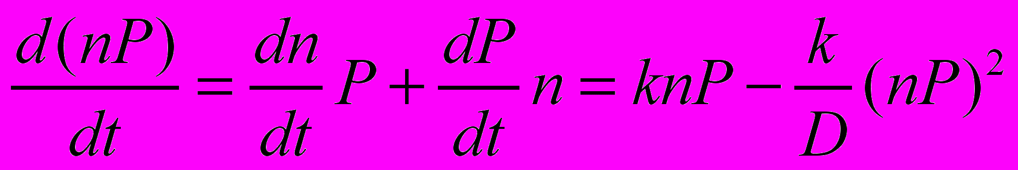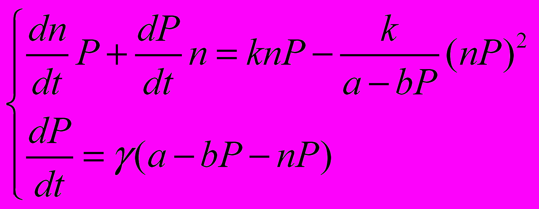 для зависимых от времени функций n(t) – количества товаров и P(t) – их средней цены. k,a,b и - коэффициенты (вообще говоря постоянные, но можно считать их и переменными, с наперед заданной временной зависимостью).