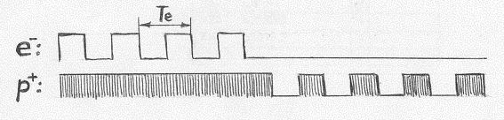 Нам представляется, что атомарная связка «протон-электрон» формируется при работе связующего алгоритма (4.7), который попеременно прерывает пульсации на электронной частоте – как у электрона, так и у протона. Эти прерывания, обеспечивающие связку «протон-электрон», мы будем называть атомными прерываниями. Результирующие «дорожки» квантовых пульсаций у связанных протона и электрона схематически изображены на Рис.4.9. Здесь показан один период атомных прерываний (Те – период пульсаций на электронной частоте). Обратим внимание: на том полупериоде атомных прерываний, когда электронные пульсации в протоне «отключены», его нуклонные пульсации имеют место. Так и должно быть, если связующий механизм манипулирует лишь электронными пульсациями.