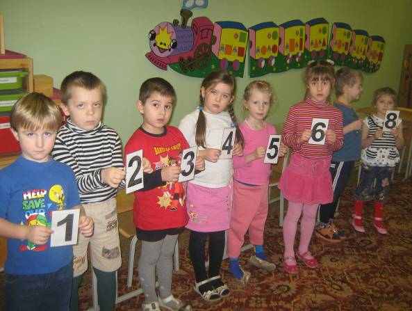 Дети старшей группы изучают порядковый счёт в соревновательной игре «Живые числа», где должны выстроиться по порядку.
