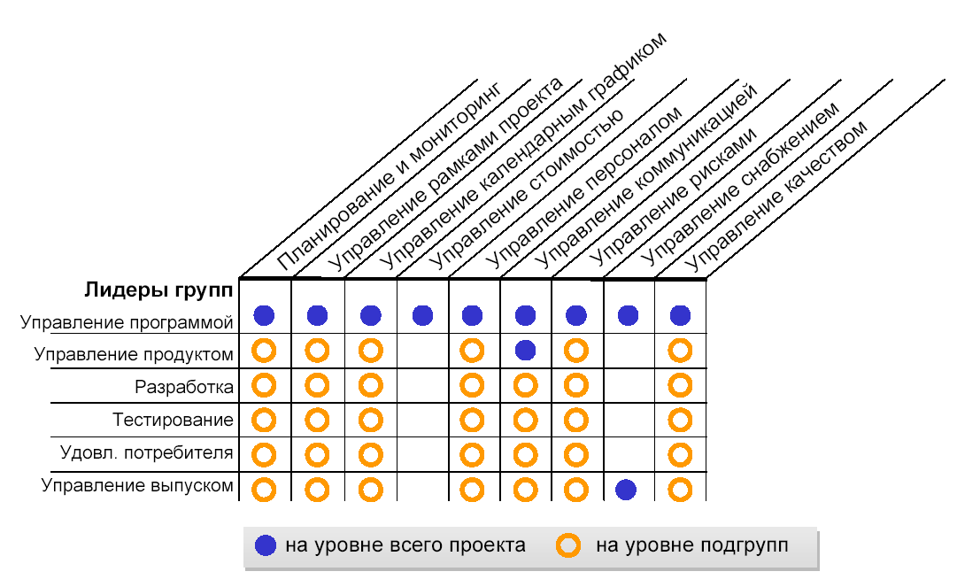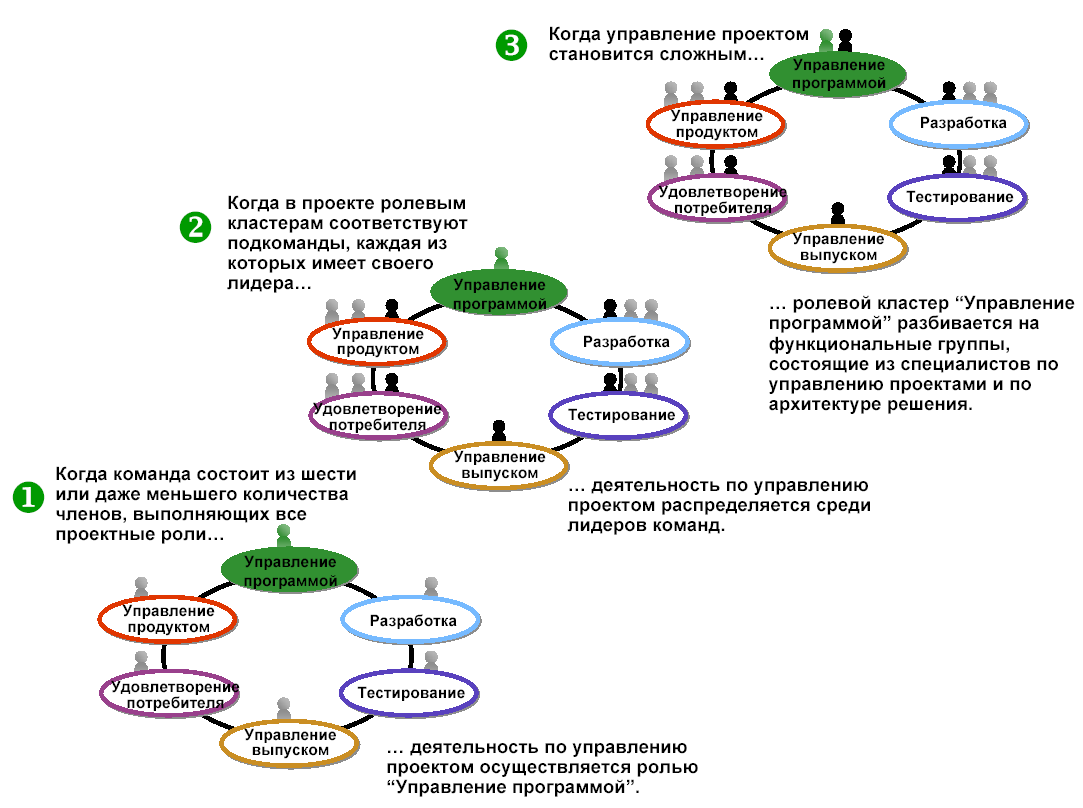 В частности, на каждый из ролевых кластеров возлагается определенная ответственность за широкий спектр задач, связанных с управлением проектом. Сюда входят вопросы управления рисками, управления качеством, управления календарным графиком, управления кадрами и т.д.