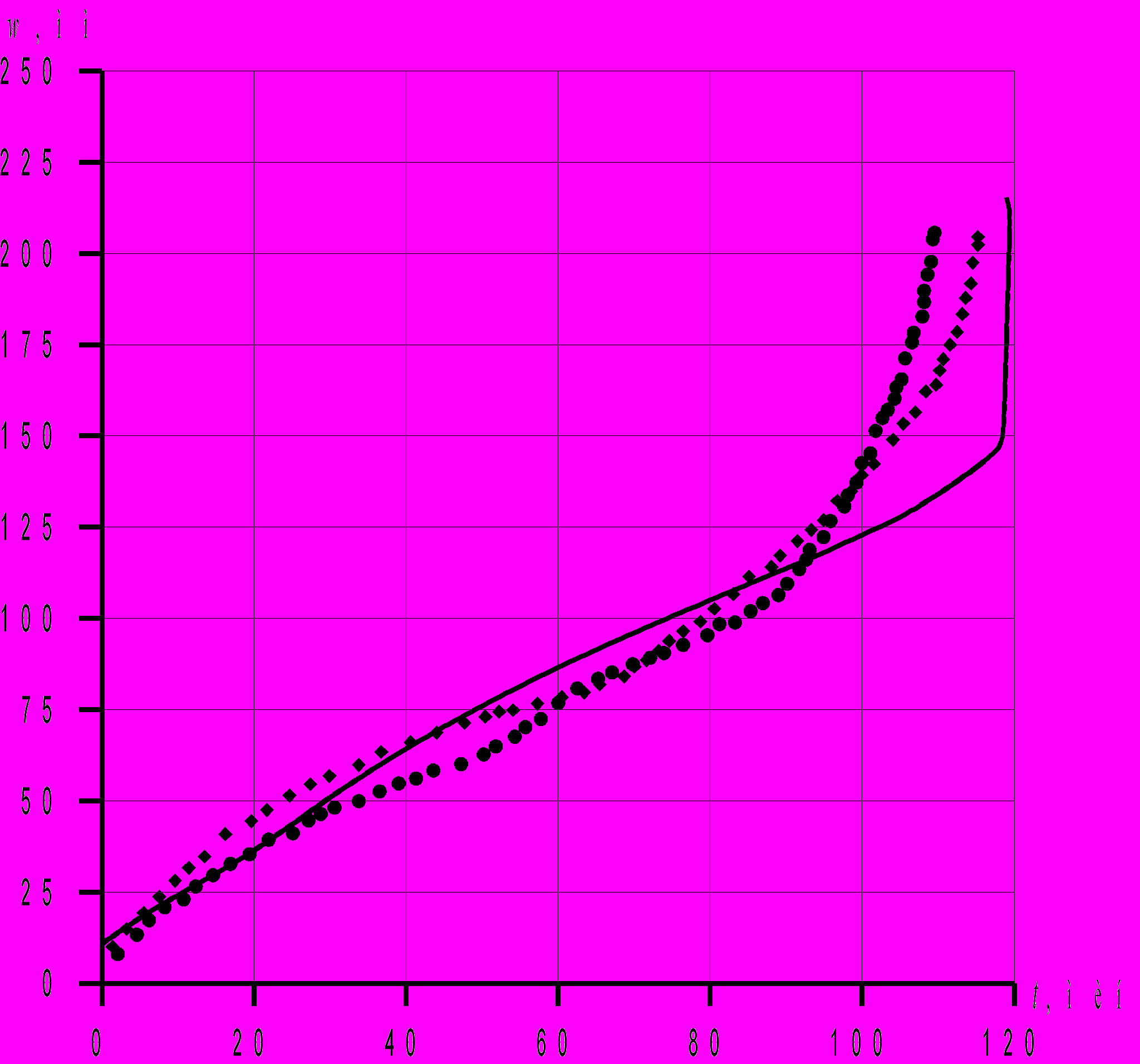 Рис. 5. Зависимость от времени максимального прогиба w плиты из керамзитобетона: - 1-й огневой эксперимент, - 2-й огневой эксперимент, - расчетная кривая