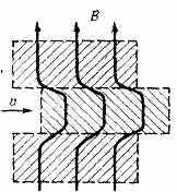 между верхним и нижним электродами (рис. 9) электрич. поля напряжённостью Е порядка Bv/c (v — скорость потока П.); напряжение с электродов подаётся во внеш. цепь.
