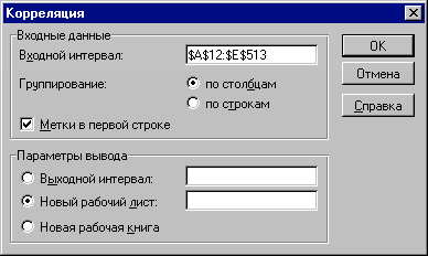 Если число исследуемых переменных больше 2, более удобным является использование инструментов анализа. Описание статистических функций КОВАР() и КОРРЕЛ() приведено в приложении 4. Инструмент анализа данных "Корреляция" Определим степень тесноты взаимосвязей между переменными V, Q, P, NCF и NPV. При этом в качестве меры будем использовать показатель корреляции R.