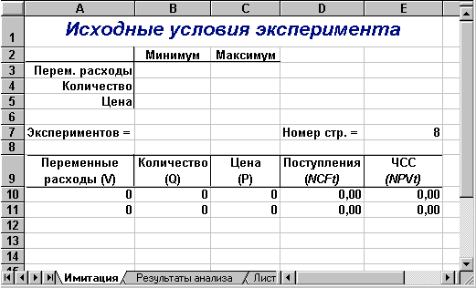 Рассмотрим реализацию выделенных шагов более подробно. Выполнение первых трех пунктов не должно вызвать особых затруднений. Введите значения постоянных переменных в ячейки В2.В4 листа "Результаты анализа". Введите значения диапазонов изменений ключевых переменных в ячейки В3.С5 листа "Имитация". Укажите в ячейке В7 число проводимых экспериментов, например - 500. Установите табличный курсор в ячейку А11.