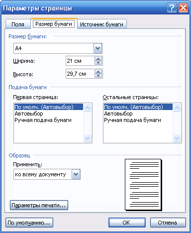 – на вкладці Бумага (рис. 6.2) діалогового вікна Параметры страницы задають розмір паперу, вибираючи його зі списку чи вводячи ширину і висоту з клавіатури, або за допомогою кнопок полів Ширина та Высота, якщо такий розмір відсутній у списку; задають спосіб подачі паперу у принтер, область дії заданих параметрів. На цій вкладці є кнопка Пара метры печати, яка дозволяє задати зразу і параметри друку всього документа чи певних його сторінок;
