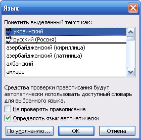 – активують засоби автоматичної перевірки правопису. Для цього вибирають меню СервисЯзыкВыбрать язык (рис. 6.5), а потім у діалоговому вікні Язык обирають потрібну мову, на якій буде вводитись текст, як наприклад у цьому вікні, та натискають кнопку ОК для однократного застосування при перевірці абзацу або натискають кнопки По умолчанию та ОК (для того, щоб будь-який документ перевірявся за замовчуванням цією мовою). Потім в меню Сервіс клацають на команді Правописание (або натискають функціональну клавішу F7);