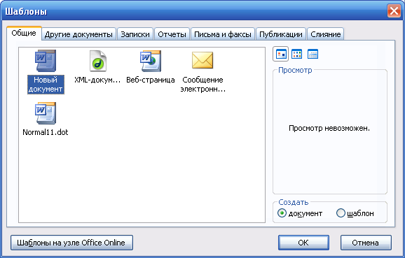 панелі інструментів Стандартная. У цьому разі буде створений із шаблоном NORMAL (новий документ або обычный).Додаткові можливості створення документів з іншими шаблонами (бланками), а також підключення Майстрів створення документів певних типів використовуються при виборі команди ФайлСоздать. Це призводить до активації Області задач, в якій відкривається панель Создание документа. Якщо потрібно створити документ на основі існуючого в програмі шаблону, треба клацнути на значку з назвою Общие шаблоны панелі Создание документа, після чого відкриється діалогове вікно Шаблоны, яке містить багато вкладок із шаблонами документів та майстрами створення документів на основі цих шаблонів (рис. 6.13).