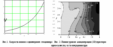 аналитически, получены одномерные стационары системы (1). Они брались в качестве начальных данных в двумерной модели. На границах задавались возмущенные значения концентрации, скорости и потенциала. Для численного решения первых трех уравнений системы использовалась разностная схема, предложенная в [2]. Численная реализация уравнения для потенциала проводилась с помощью итерационного метода продольно-поперечной прогонки [3]. В рассчитываемом диапазоне параметров течение плазмы оказалось устойчивым. График скорости ионов в стационаре изображен на рис. 1. Пример линий уровня концентрации в двумерной модели представлен на рис. 2.