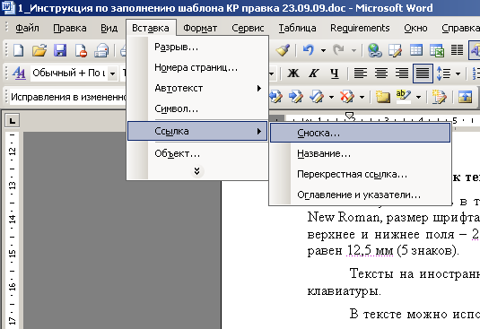 Использование надписей, надстрочных и подстрочных символов, сносок в тексте допустимо. Оформление сносок производится через меню «Вставка ->Ссылка ->Сноска».