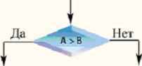Блок "решение" используется для обозначения переходов управления по условию. В каждом блоке "решение" должны быть указаны вопрос, условие или сравнение, которые он определяет.