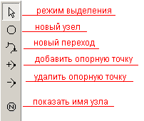 - Імена вузлів.Якщо з малюнка не очевидно, яке ім'я у даного вузла,необхідно виділити цей вузол і натиснути кнопку на лівій інструментальної панелі. Перейти в режим редагування імені можна подвійним клацанням миші на його зображенні або за допомогою команди «Редагувати / Редагувати як текст (F2)» головного меню;