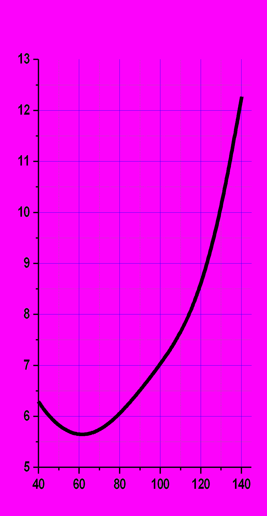 Рис. 1. Типова залежність питомої Q (л/100км) витрати палива від швидкості сталого руху V (км/год) для автомобіля (паливна характеристика сталого руху).