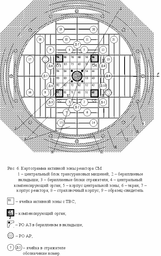 В третьей главе излагаются результаты спектрометрических экспериментов по определению параметров нейтронных полей в высокопоточном реакторе СМ-2 (см. рис. 6). Первый спектрометрический эксперимент проведён в 1988 году после 10 лет интенсивной работы реактора. Были выбраны каналы: ВЭК-4, БКС-4, ВЭК-6, ВЭК-11, как характерные для каждого ряда отражателя. В каждом канале измерена скорость реакции для 14 пороговых реакций: 237Np(n, f), 103Rh(n, n’), 115In(n, n’), 111Cd(n, n’), 58Ni(n, p), 54Fe(n, p), 204Pb(n, n’), 46Ti(n, p), 47Ti(n, p), 48Ti(n, p), 56Fe(n, p), 27Al(n,), 93Nb(n, 2n), 90Zr(n, 2n). В области низких энергий измерены скорости для 11 (n,γ)- реакций при облучении в экранах из Al, B, Cd: 63Cu(n,γ), 197Au(n, ), 59Co(n, ), 58Fe(n, ), 55Mn(n, ), 93Nb(n, ), 235U(n,f), 45Sc(n, γ), 139La(n, γ), 23Na(n, γ), 115In(n, ). ДНА, облучались в кадмиевых и борных экранах. Результаты приведены в таблице 3 [17].
