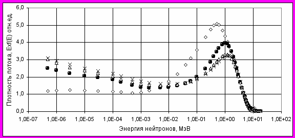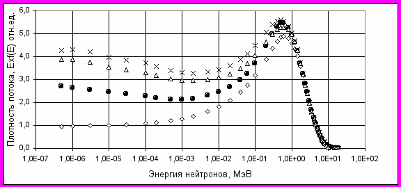 Рис. 8. Спектры нейтронов в каналах при водяном заполнении: