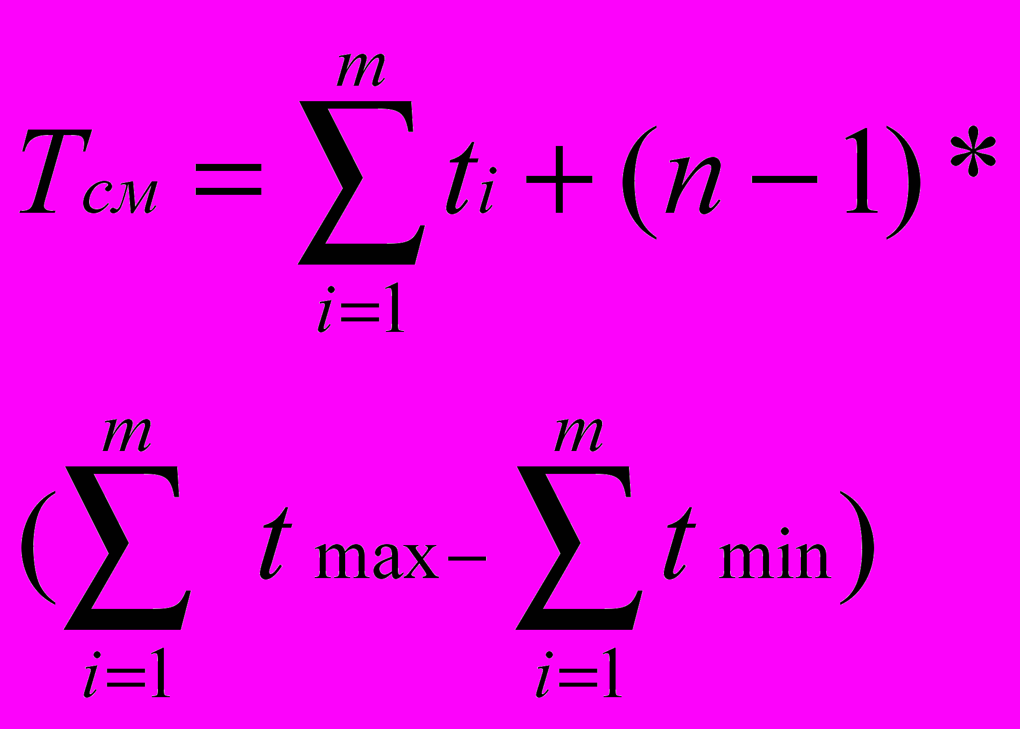 | Длительность производственного цикла при смешанном сочетании операций (Тсм) | tmin – максимальное время обработки детали на операции | ![]() | ![]() |
