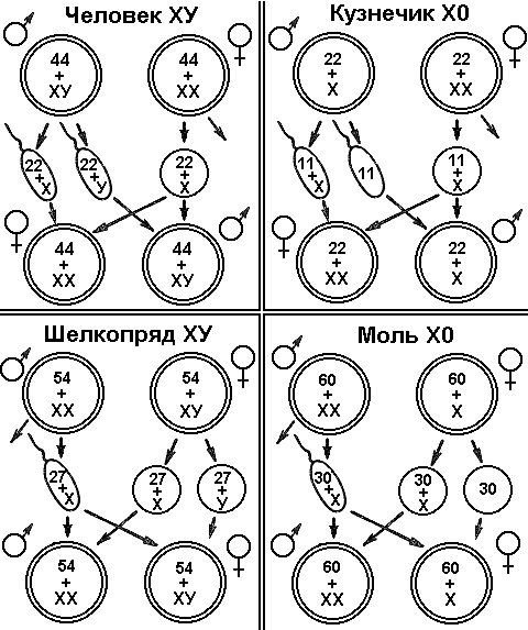 - Женский пол гетерогаметен; 50% гамет несут Х-, 50% — не имеют половой хромосомы.