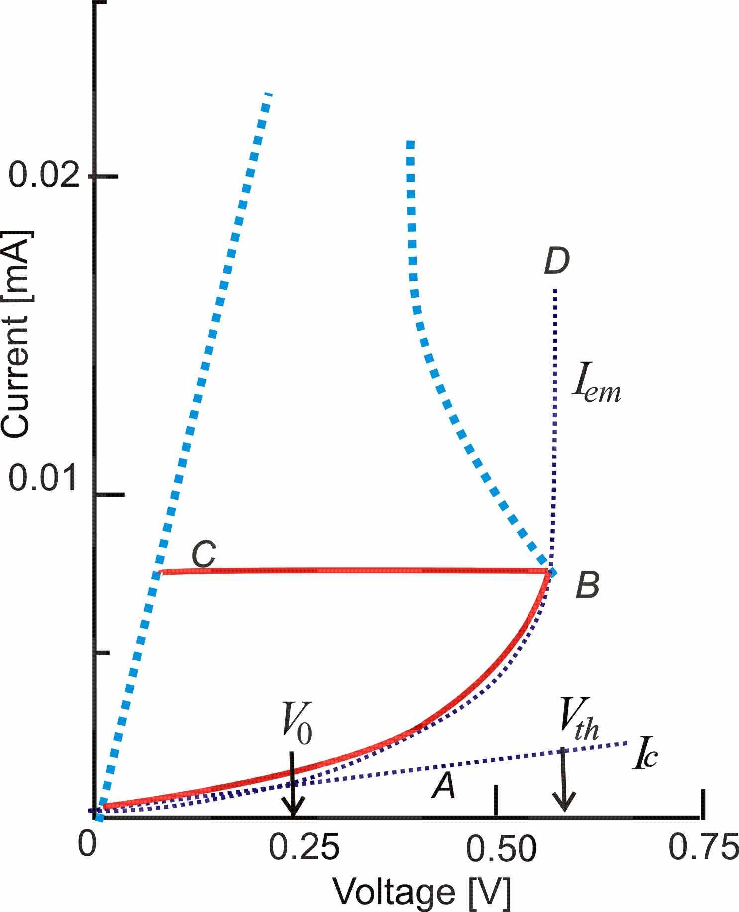 На рис. 7 показана вольт-амперная характеристика ФПЯ, линия 0 BC соответствует характеристике, которая должна получиться в соответствии с эмиссионной моделью. Точка B имеет координаты Vth, Ith. Это точка включения ФПЯ. Пунктирная линия 0А характеризует ток Ic, который линейно зависит от приложенного напряжения, пунктирная линия 0B характеризует эмиссионный ток Iem. Сумма этих токов характеризуется сплошной линией 0B, которая соответствует ВАХ ФПЯ до точки включения. Расчетная линия до точки B совпадает с экспериментальной. После точки B экспериментальная характеристика включения представлена пунктирными линиями. Ее ход задается сопротивлением внешней цепи. Вторая пунктирная линия, идущая из 0, соответствует включенному состоянию. Участок BD соответствует эмиссионному пробою и наблюдался бы в случае отсутствия шнурования.