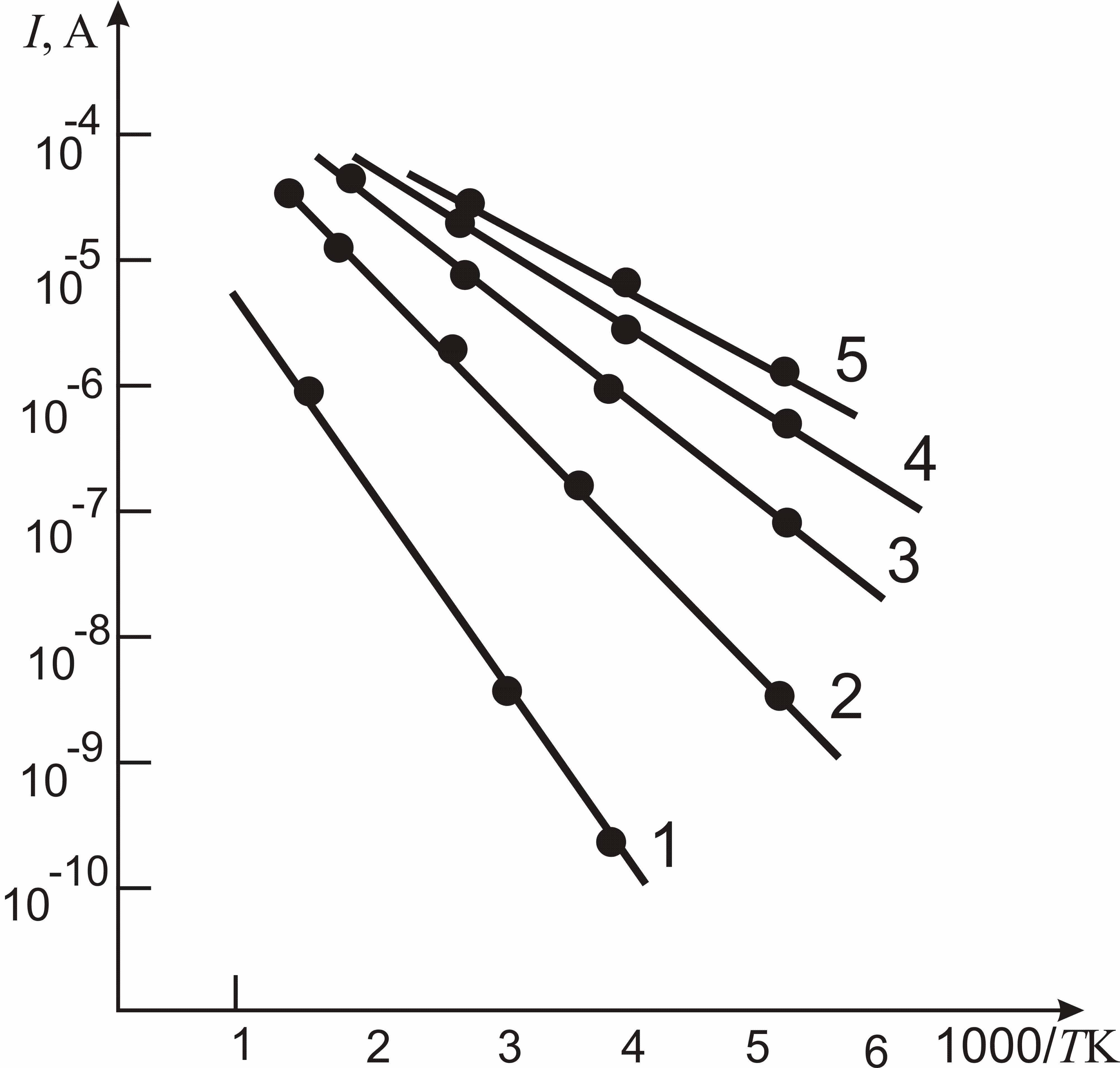 Как видно из приведенных зависимостей(рисунок 5), с увеличением приложенного к образцу напряжения меняется наклон прямых. При условии, что распределение электрического поля в образце равномерное, это означает, что с ростом поля проводимость образца возрастает и при этом энергия температурной активации проводимости тем меньше, чем выше электрическое поле.
