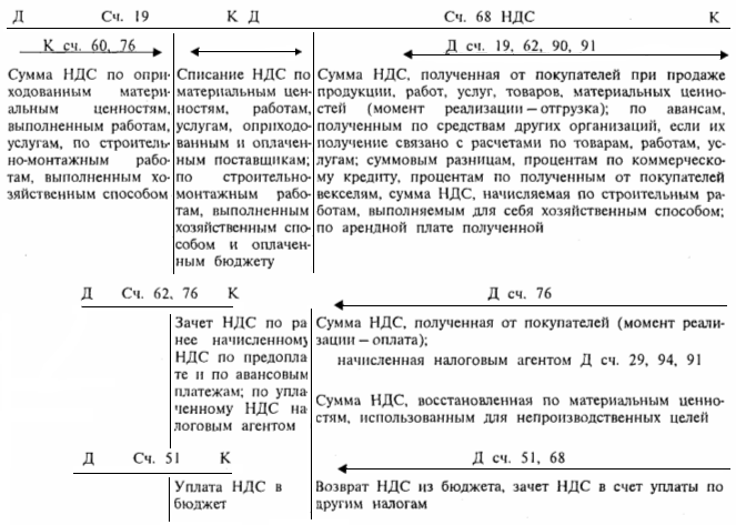 При продаже товаров (работ, услуг), облагаемых НДС, сумма НДСпол отражается по кредиту счета 68, сумма НДСупл отражается по дебету счета 68; в бюджет уплачивается разница между НДСпол, и НДСупл;, в случае если НДСупл окажется больше НДСпол, бюджет зачитывает свой долг в счет уплаты других налогов в данный бюджет либо возвращает НДС из бюджета.;