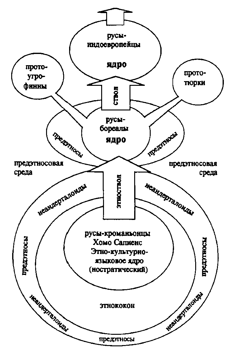 - история этническо-культурно-языкового ядра («главной ветви*, или ствола, этнодрева) подвида Хомо сапиенс сапиенс — бореалов — протоиндоевропейцев — праиндоевропей-цев — индоевропейцев — и есть история русов с древнейших времен и до XIX века н.э., когда поздние русы (прямые потомки древних русов) разделились па белорусов, русских и украинцев (точнее, на белорусов, великороссов и малороссов).