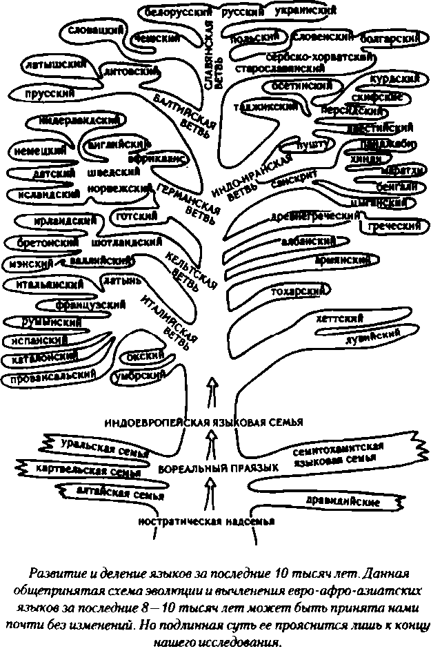 Но надо отдать должное лингвистам, которые, пожалуй, достигли наибольших успехов в индоевропеистике. Благодаря им мы можем довольно-таки четко ориентироваться в этом раскидистом древе, во всяком случае, не слишком плутать, ведь у нас есть проверенные и четкие вехи. Но сразу же добавим, речь идет об индоевропейской языковой семье. И потому не следует всегда однозначно отождествлять язык и народ, так как бывает, что эти понятия не соответствуют: неиндоевропейский этнос, подпавший под влияние индоевропейцев, может быть носителем их языка, и наоборот. В каждом конкретном случае необходимо помнить об этом.