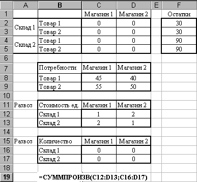 На следующем шаге разместите исходные данные в Excel, как показано на рис. 2.41. Для неизвестных (х1, х2, … х8) отведены ячейки C2:D5. Для удобства записи целевой функции, на основе таблицы C2:D5, создана промежуточная таблица С16:D17. В ней суммируются данные по складам: С16=C2+C3 (т.е. х1+х3), D16=D2+D3 (х2+х4), C17=C4+C5 (х5+х7), D16=D2+D3 (х6+х8).