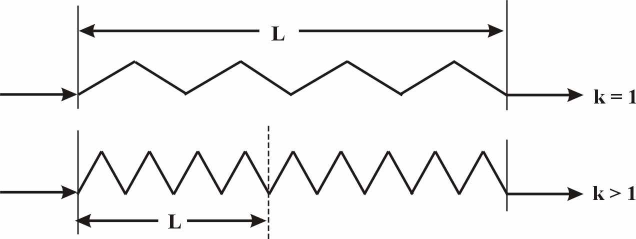 Предположим, что в первом состоянии между точками А и В содержится n элементарных пространств, а во втором состоянии, между точками C и D, содержится kn элементарных пространств. Понятно, что во втором случае n элементарных пространств будет содержаться между точками C и E.