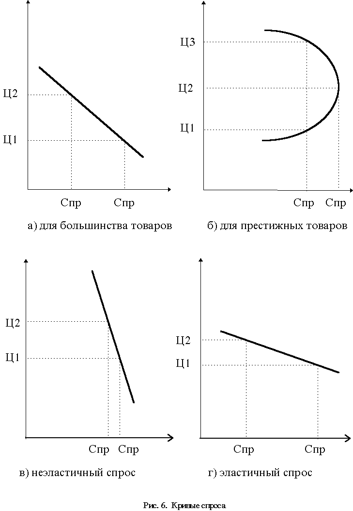 Большинство кривых спроса стремится вниз по прямой или изогнутой линии, как на рисунке а. Однако в случаях с престижными товарами кривая спроса иногда имеет положительный наклон типа представленного на рисунке б. Потребители посчитали более высокую цену показателем более высокого качества или большей желательности товара. Однако при слишком высокой цене (Ц3) уровень спроса оказывается ниже, чем при цене Ц2.