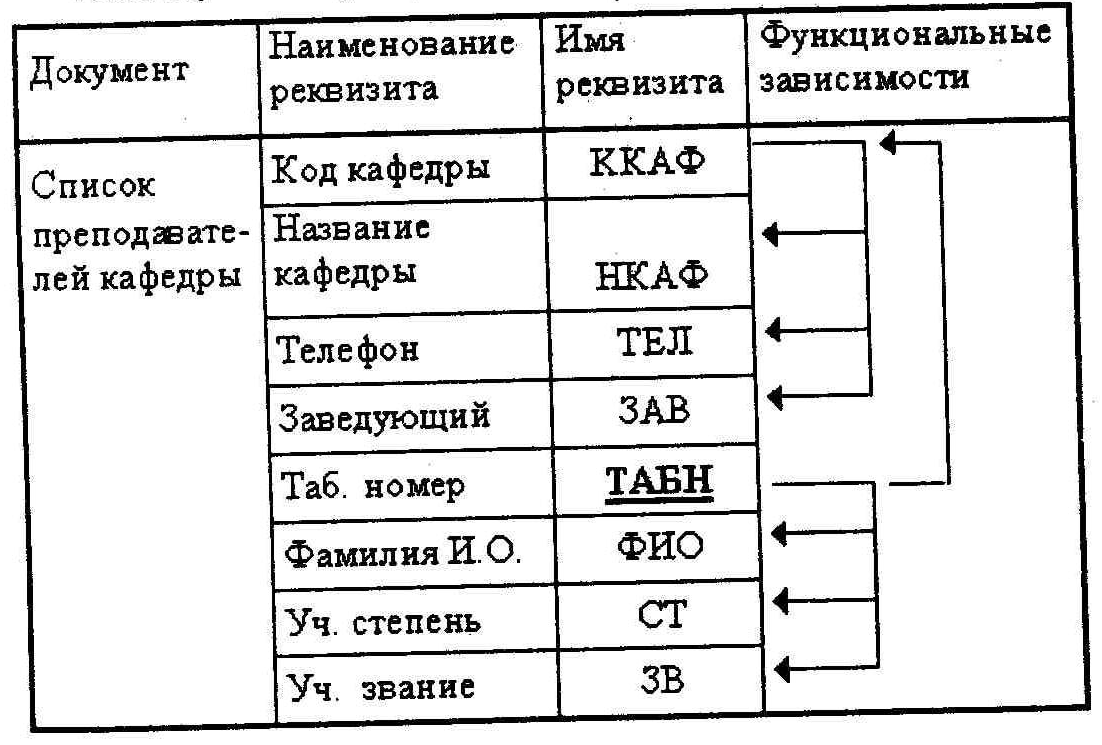 Все установленные функциональные зависимости реквизитов документа "Список преподавателей кафедры" отражены в табл. 2.1.