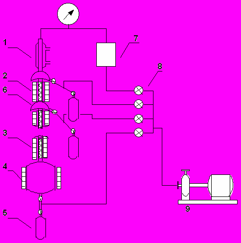 ![]() | Рис 1. Схема ректификационой колонны. 1 – конденсатор, 2 – дополнительная ректификационная секция, 3 – основная ректификационная секция, 4 – куб, 5 – ампула, 6 – отборное устройство, 7 – маностат, 8 – краны | ![]() |