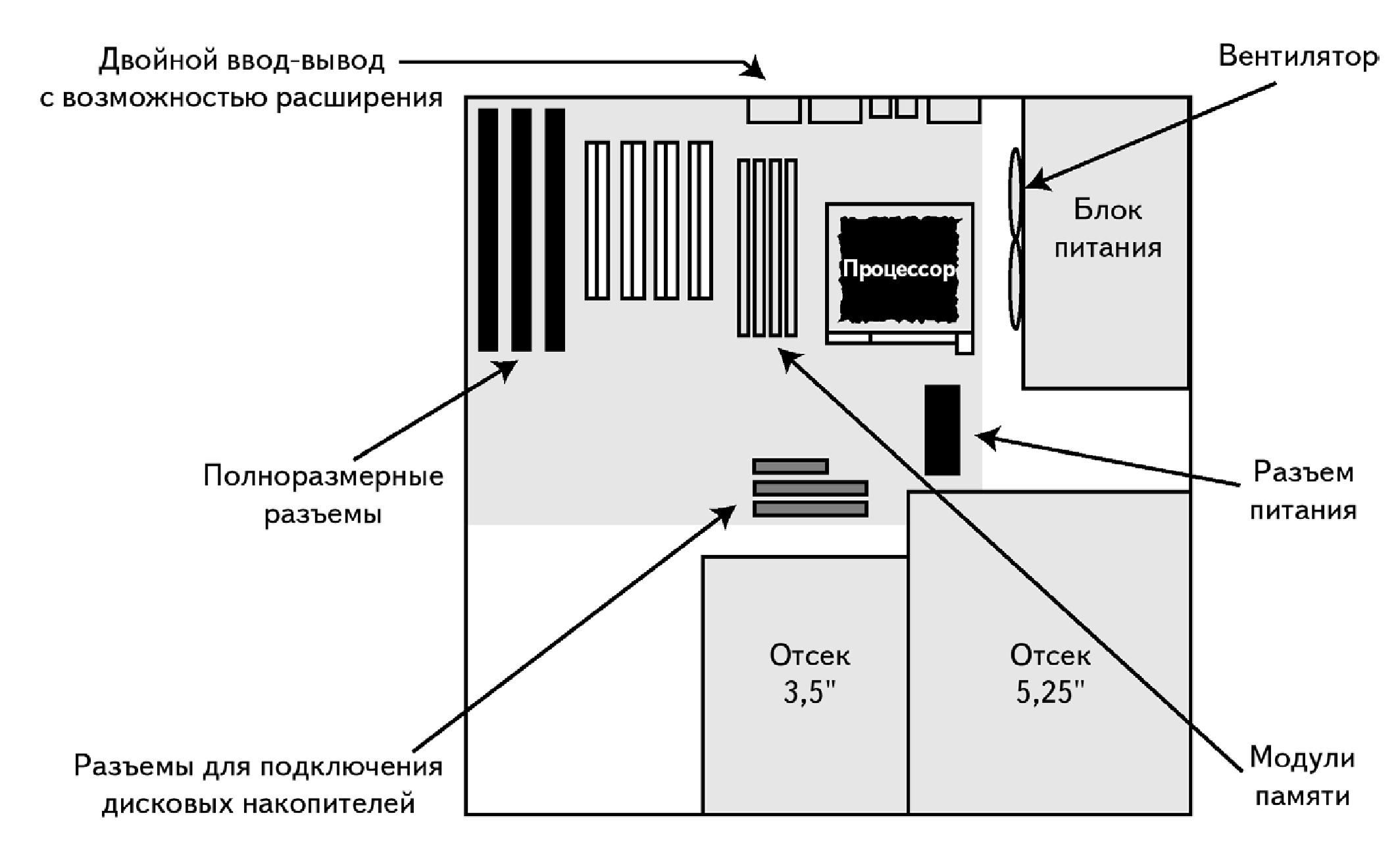 • Более удачное расположение внутренних разъемов ввода-вывода. Эти разъемы для накопителей на гибких и жестких дисках смещены и находятся не под разъемами расширения или самими накопителями, а рядом с ними. Поэтому можно уменьшить длину внутренних кабелей к накопителям, а для доступа к разъемам не нужно убирать одну из плат или накопитель.