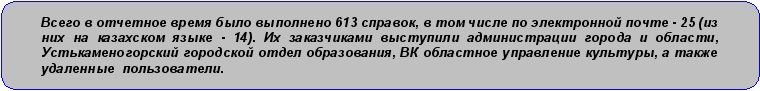«Виртуальная справочная служба» (inlibrary.kz/ask/index.php) нашей библиотеки ориентирована на удаленное предоставление фактографических, уточняющих, тематических справок (к примеру, о наличии того или иного издания в библиотеке, уточнение даты/названия и т.д.), что немаловажно при постоянной занятости специалистов. Запросы по тематике разнообразны, среди них: научно-техническая политика Китая, Японии и США; семантические процессы в современном русском языке; оценка экономического потенциала ВКО с учетом параметров развития производительных сил и расселения населения; способ сорбционной очистки промышленных вод ВКО от ионов тяжелых металлов гуминовыми сорбентами; организация оценки и налогообложения недвижимости; передача эпитетов с английского на русский язык; социальный аудит, социальная и социологическая диагностика; унификации тюркских алфавитов, орфографии и терминологии и др.