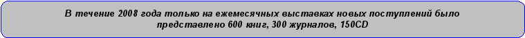 налитико-синтетическая обработка и создание библиографических баз данных (электронных каталогов) является одним из главных процессов, обеспечивающих качество, полноту и оперативность обслуживания читателей библиотеки. Этому направлению мы всегда придаем особенное внимание. В отчетный период выполнены все запланированные процессы по поддержке и актуализации справочно-библиографического аппарата (СБА) библиотеки: изъятие карточек и записей на списанную литературу, вливание карточек в печатные каталоги (ГАК), ретроконверсия печатных карточек в машиночитаемую форму, текущая редакция, пополнение новыми библиографическими записями (БЗ). На конец 2008 года объем электронного каталога (системы РАБИС) составил 169 812 БЗ. Из них в отчетный период введено 10 981 БЗ, в том числе: книг – 4 463, статей – 6 074, медиаизданий – 444. С целью создания веб-каталога и повышения эффективности в автоматизации библиотечных процессов в 2008 году было приобретено новое программное обеспечение ИРБИС (разработка Государственной Публичной Научно-Технической Библиотеки России). Базовый комплект «Система ИРБИС 64 под MS Windows» содержит пять основных модулей, обеспечивающих автоматизацию ключевых библиотечно-библиографических процессов и модуль сервера. К концу отчетного периода успешно внедрены два модуля - АРМы «Комплектатор» и «Каталогизатор». На основе изучения сопроводительной документации к данному ПО и предварительного апробирования разработаны методические решения по алгоритму создания записей и разработке соответствующего лингвистического обеспечения (справочники, классификаторы и т.д.). Начата работа по созданию электронного каталога, решаются проблемы по конвертации электронного каталога из РАБИС в ИРБИС, а также размещению э/каталога в Интернет.