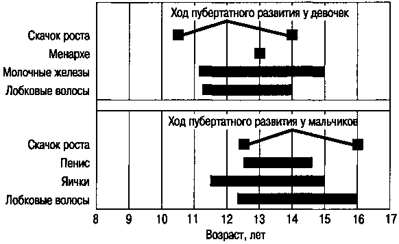 Рис. 9.1. Ход пубертатного развития у мальчиков и девочек