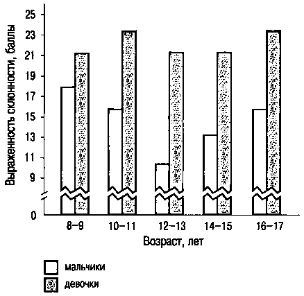 Сравнение склонности к переживанию базовых эмоций у школьников и школьниц разного возраста, проведенное М. С. Пономаревой, показало, что у девочек и девушек во всех возрастных группах склонность к страху выражена значительно больше, чем у мальчиков и юношей (рис. 4.2).