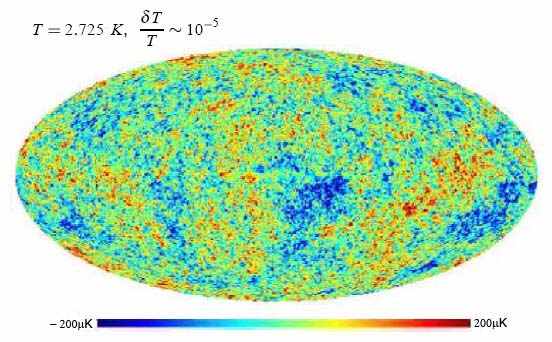 Измеряя температуру этого реликтового электромагнитного излучения, пришедшего к нам с разных направлений на небе, мы узнаём, какие области были теплее или холоднее (а значит, плотнее или разреженнее), чем в среднем по Вселенной, а главное - насколько они были теплее или холоднее. Результат этих измерений состоит в том, что Вселенная в возрасте 300 тыс. лет была гораздо более однородной, чем сегодня: вариации температуры и плотности составляли тогда менее 10–4 (0,01%) от средних значений. Тем не менее, эти вариации существовали: с разных направлений электромагнитное излучение приходит с несколько различной температурой. Это показано на рис.3, где изображено распределение температуры по небесной сфере (фотоснимок ранней Вселенной) за вычетом средней температуры 2,725 градусов Кельвина; более холодные области показаны синим, более теплые - красным цветом [4*].