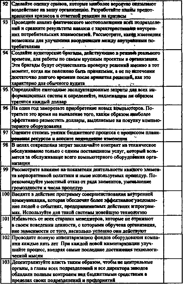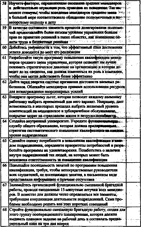 | 17 | Разработайте систему оценок вкладов каждого подразжяенда в общую корпоративную конкурентоспособность. Базируясь на этих оценках, учредите системы, в рамках которых кащдое подразделение будет стремиться вносить все больший вклад * общую конкурентоспособность корпорации | |